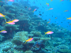 そこに、ハナダイの群とかアジの群とか かなり見ごたえがある。 もちろん、サンゴに欠かせない魚はほとんどいる。