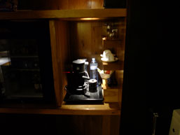 | ↑入り口の看板 | ↑広くて寝心地のよいベット | ↑びみょ〜なソファー 荷物が置かれてるが... | ↑大活躍なエスプレッソマシーン |