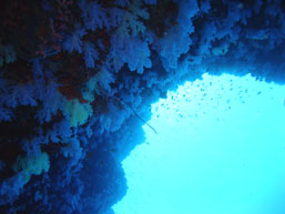 深度を上げてくるとオーバーハングの中は、ソフトコーラルがいっぱい詰まっている。